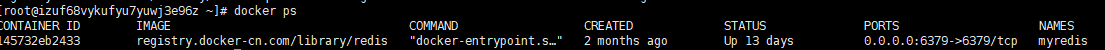 使用docker ps 查看当前运行镜像,可以发现Redis 镜像已启动: